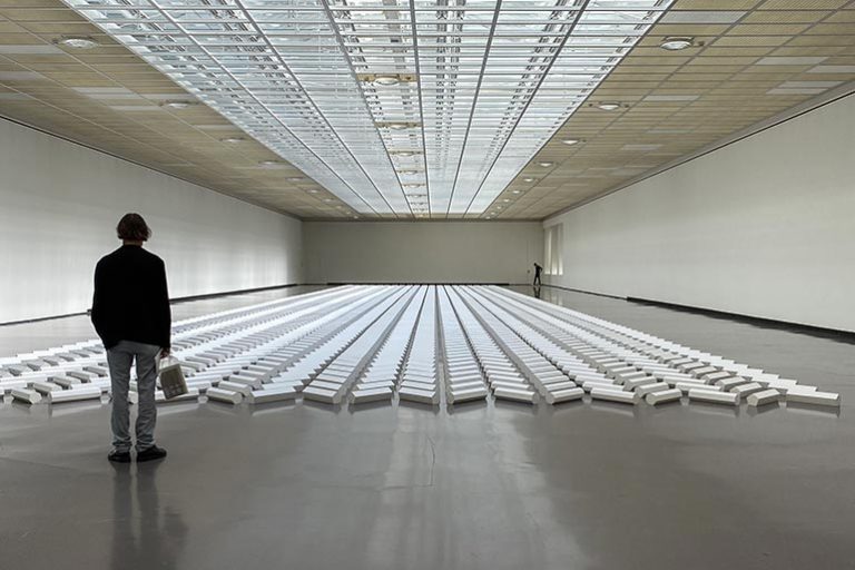 Ритмическая инсталляция в Художественном музее Цюриха очень большая, она занимает всю выставочную площадь зала — 500 кв. метров, число элементов в произведении — 2000. The 2000 Sculpture — название инсталляции, созданной в 1992 году. Она состоит из 2 000 белых объектов-призм, размер каждой — 50×18 сантиметров, 20 рядов по 100 штук в каждом. Бруски-призмы не одинаковые в основании — глаз внимательного зрителя это обязательно отметит. Граней в многоугольниках пять, семь или девять. Повторяющийся узор композиции напоминает то ли елочки, то ли крестики, то ли птичек, то ли буквы (они же из палочек состоят) — все зависит от угла зрения зрителя, скорости его движения вокруг инсталляции и дневного света, который независимо от погоды проникает в помещение сквозь стеклянный потолок. В огромном зале цюрихского музея нет колонн, и эффект восприятия, каким он был 30 и 20 лет назад — во время перaвых экспозиций — остаётся таким же потрясающим, чарующим: простые формы объектов, уложенных ритмическим образом, при помощи магии света превращают окружающее пространство в необыкновенный меняющийся мир — оазис спокойствия, умиротворения и красоты.