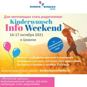 Будучи единственным публичным мероприятием в Швейцарии, посвященным всему, что связано с желанием иметь детей, «Желанный малыш — Kinderwunsch Info Weekend» дает полномасштабную информацию о фертильности и предлагает всем заинтересованным ценную платформу для обмена мнениями, опытом и советами. Национальные и международные специалисты делятся своими знаниями и опытом по всему спектру тем. Информационные выходные «Желанный малыш — Kinderwunsch Info Weekend» организуются и патронируются компанией Airdoc Health Travel GmbH.